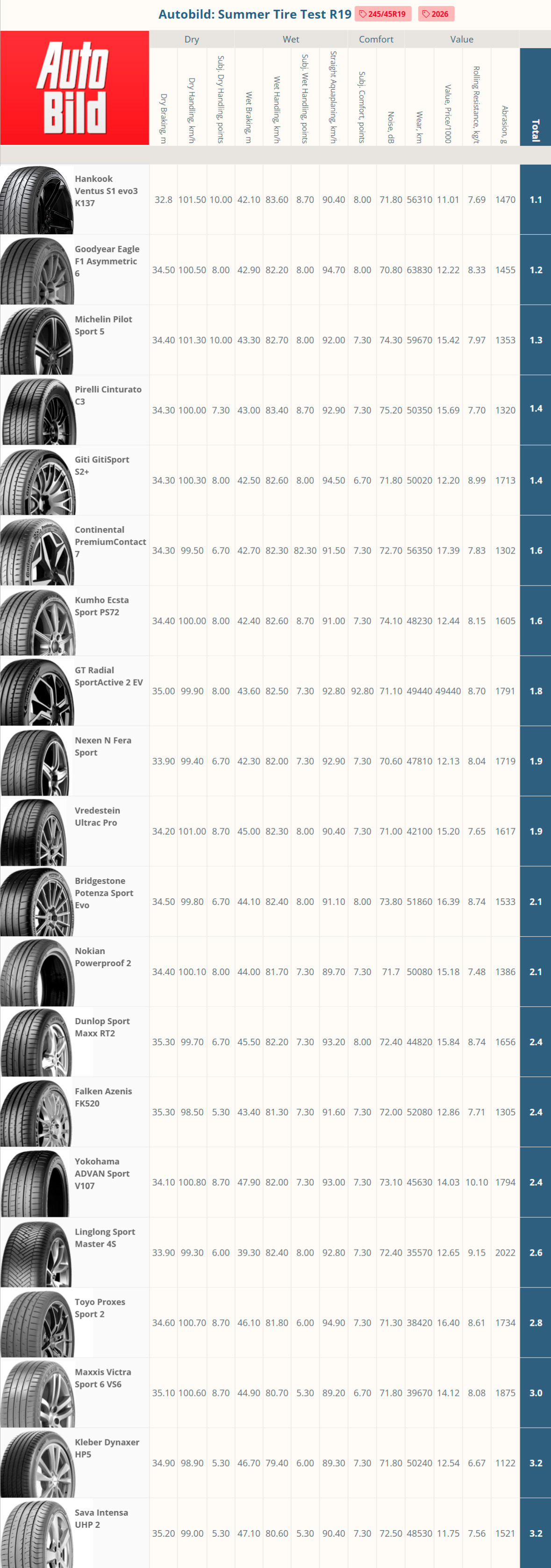 Autobild: Summer Tire Test R19 2026
